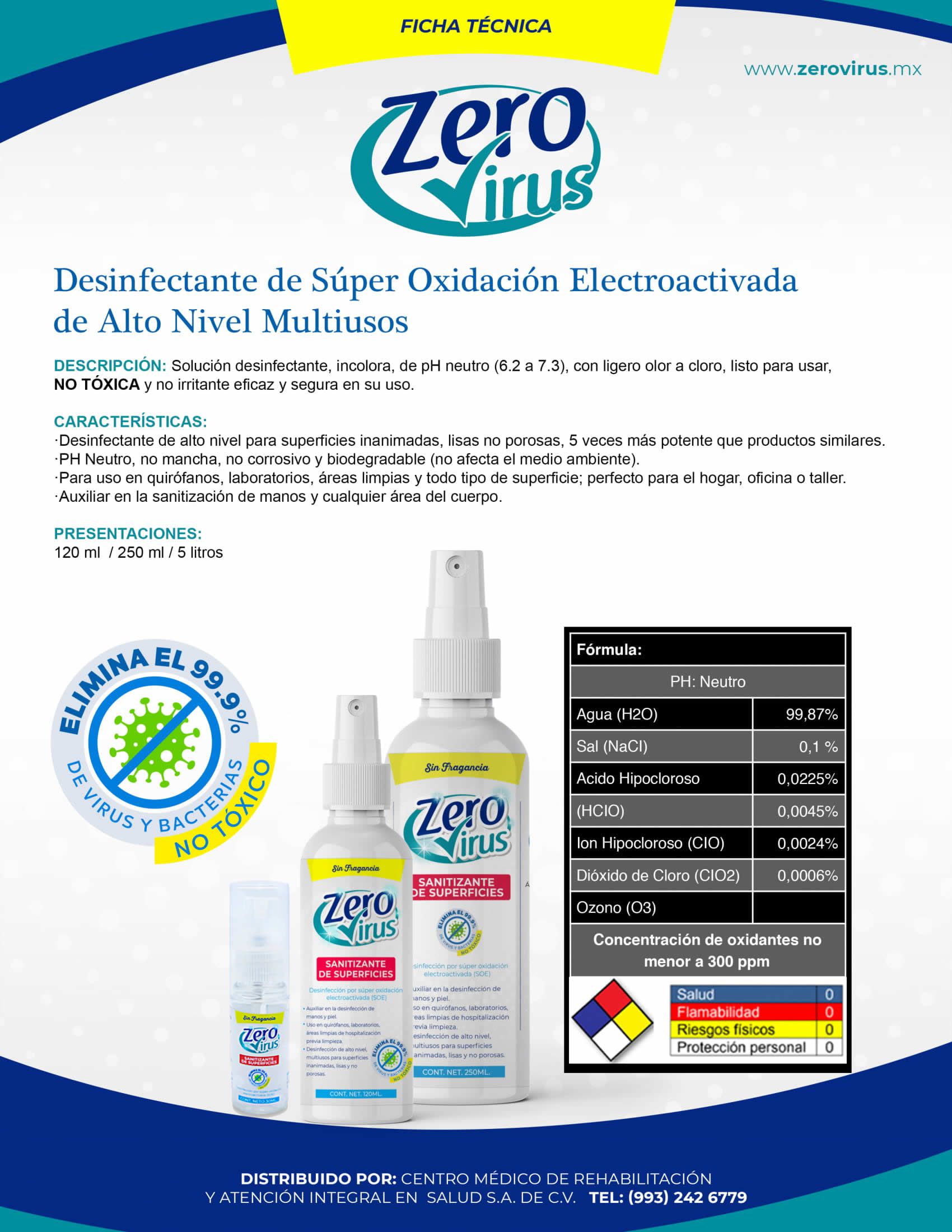 Solución desinfectante, incolora, de pH neutro (6.2 a 7.3), con ligero olor a cloro, listo para usar, NO TÓXICA y no irritante eficaz y segura en su uso.