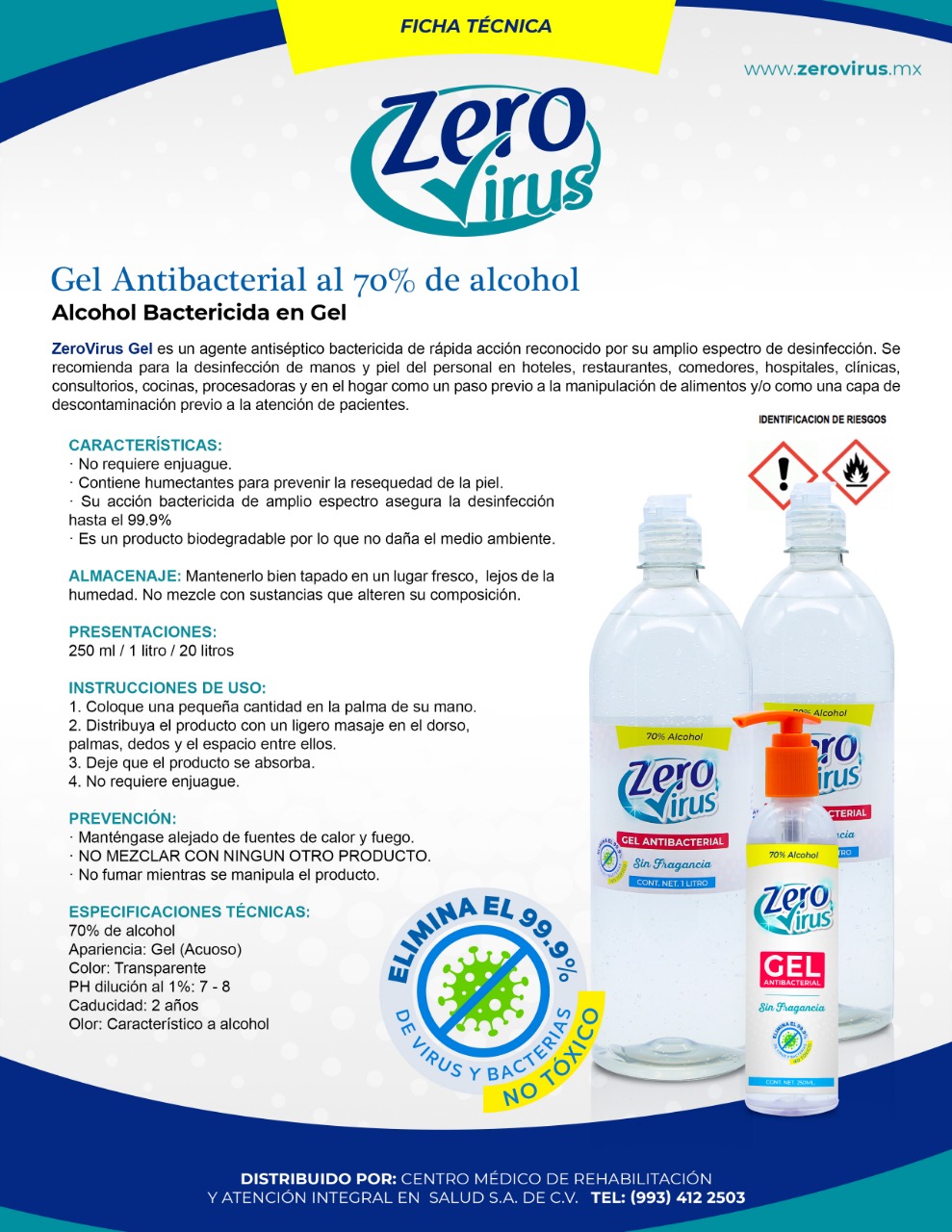 Zero Virus Gel es un agente antiséptico bactericida de rápida acción reconocido por su amplio espectro de desinfección. Se recomienda para la desinfección de manos y piel del personal en hoteles, restaurantes, comedores, hospitales, clínicas, consultorios, cocinas, procesadoras y en el hogar como un paso previo a la manipulación de alimentos y/o como una capa de descontaminación previo a la atención de pacientes.