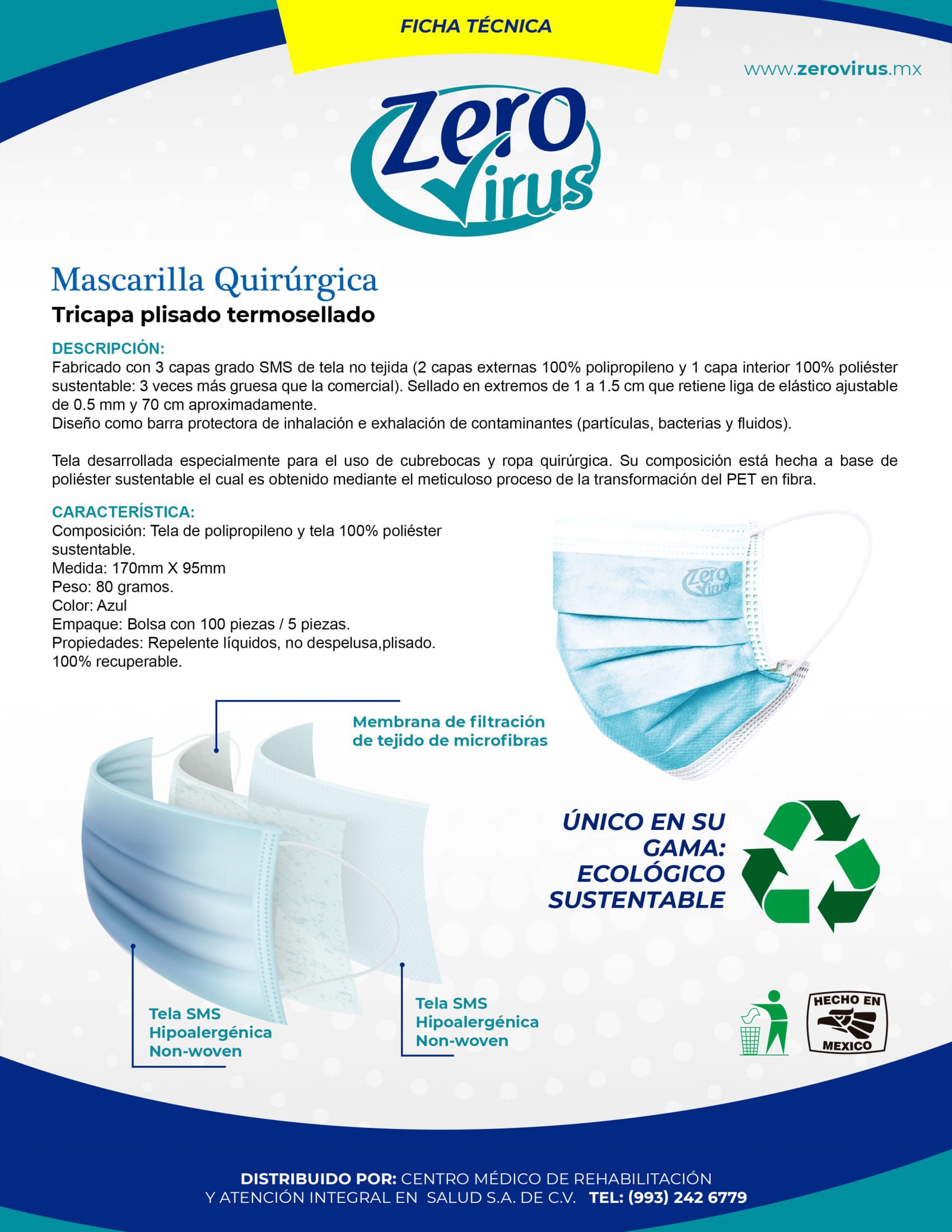 Mascarilla Quirúrgica Tricapa plisado termosellado fabricado con 3 capas de tela no tejida sellado en extremos de 1 a 1.5 cm que retiene liga de elástico ajustable de 0.5 mm y 70 cm aproximadamente. Diseño como barra protectora de inhalación e exhalación de contaminantes (partículas, bacterias y fluidos).